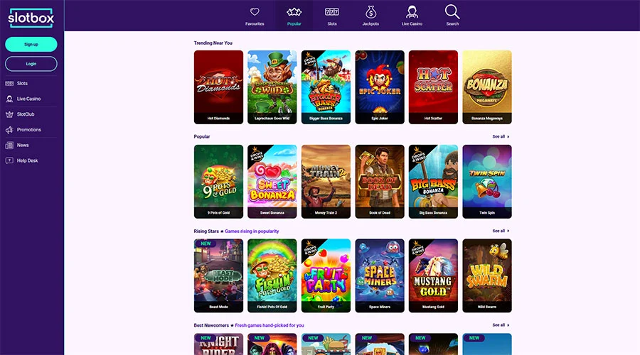 Slotbox Casino采用用户友好的设计,支持多平台访问,包括桌面和移动设备。清晰简洁的界面让玩家能够快速找到自己喜欢的游戏,享受流畅的操作体验。